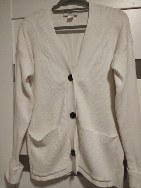 Sweter damski młodzieżowy typu kardigan zapinany na guziki z kieszeniami firmy Heine. Kolor biały ciepły i wygodny. ...